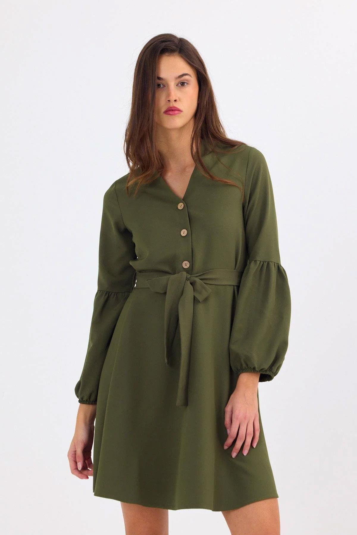 Yaka Tipi: Yuvarlak yaka (sade ve zamansız bir duruş sunar) Detay: Önü düğmeli ve balon kol detaylı (modern ve feminen bir görünüm kazandırır) Kesim: Diz hizasında, dökümlü kesim (vücuda oturmayan yapısıyla rahatlık sağlar) Kumaş Türü: Dokuma Kumaş (dört mevsim kullanılabilir, hafif ve dayanıklıdır) Beden: Standart beden seçenekleriyle uyumludur