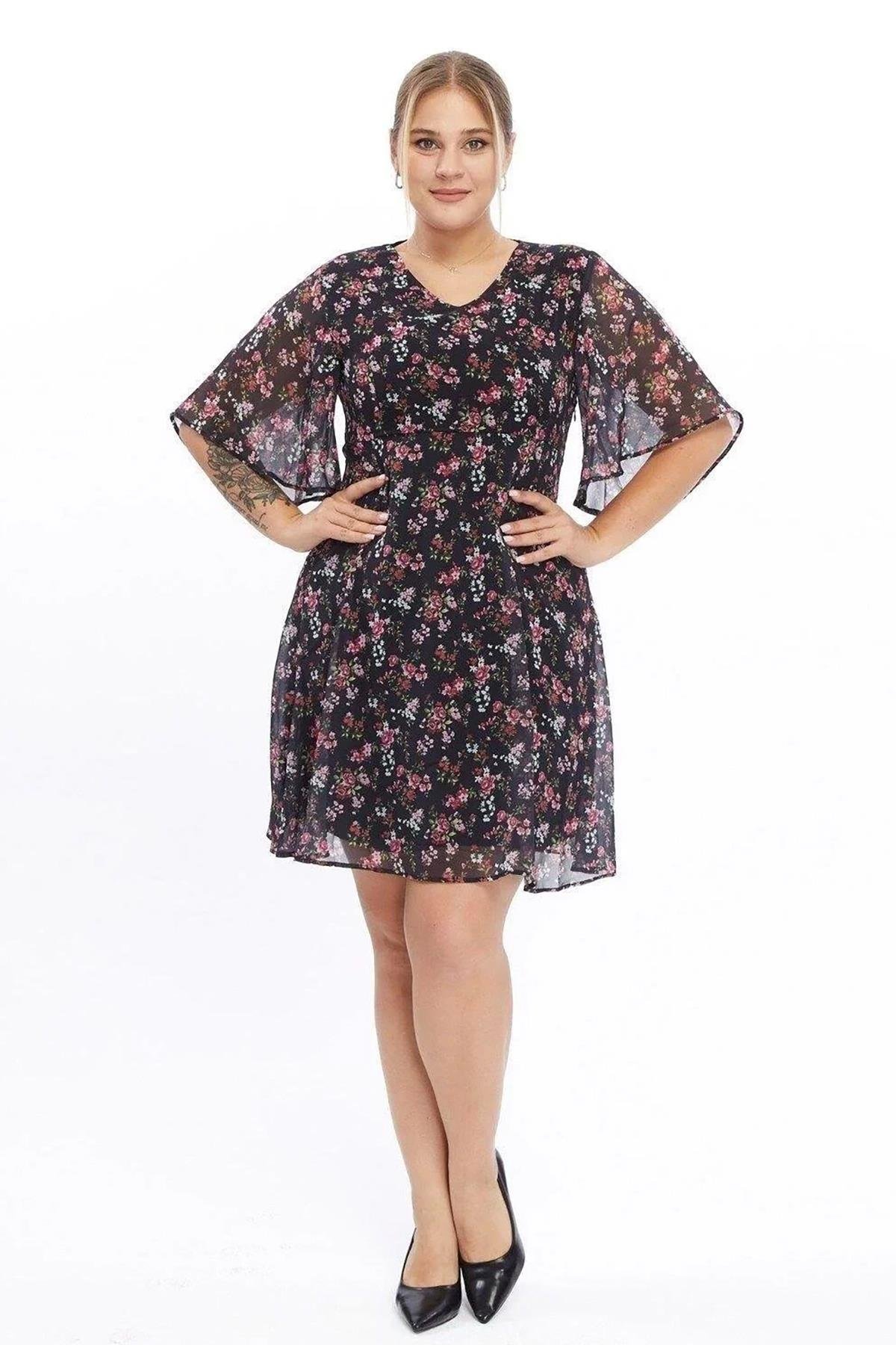 Kadın Çiçek Desenli Melek Kol Büyük Beden Şİfon Elbise 4496/100