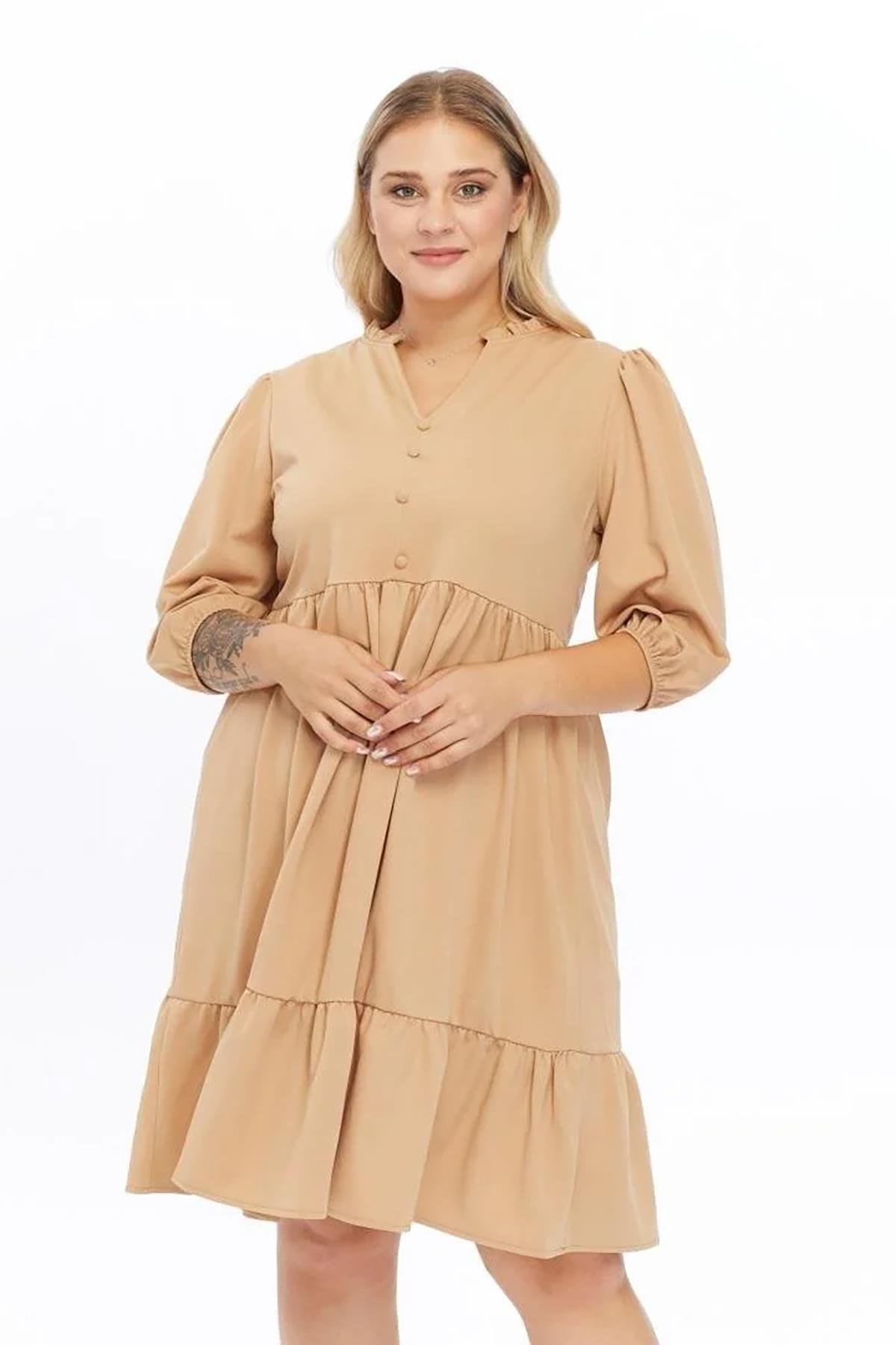 Kadın V Yaka Fırfır Detaylı Önden Top Düğmeli 4/3 Kol Midi Boy Büyük Beden Elbise 4415/105