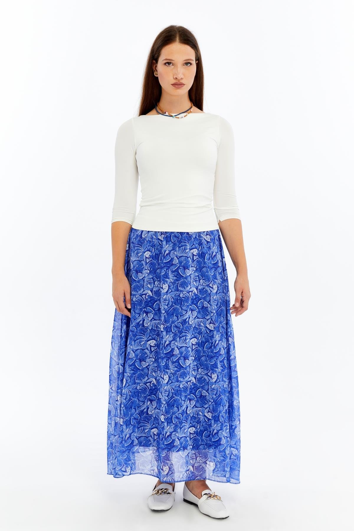 Apsen Kadın 2201/95 Mavi Çiçek Desenli Astarlı Şifon Uzun Boy Dokuma Etek