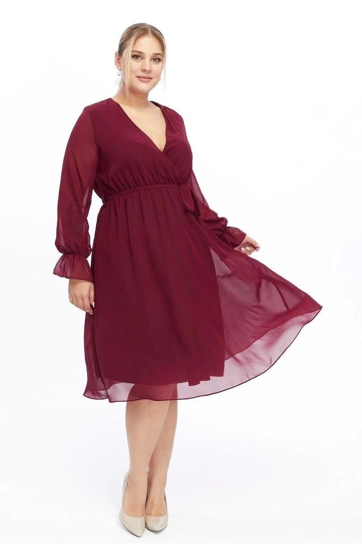 Kadın Kruvaze Yaka Kuşaklı Büyük Beden Uzun Kol Midi Boy Şifon Elbise 4450/110