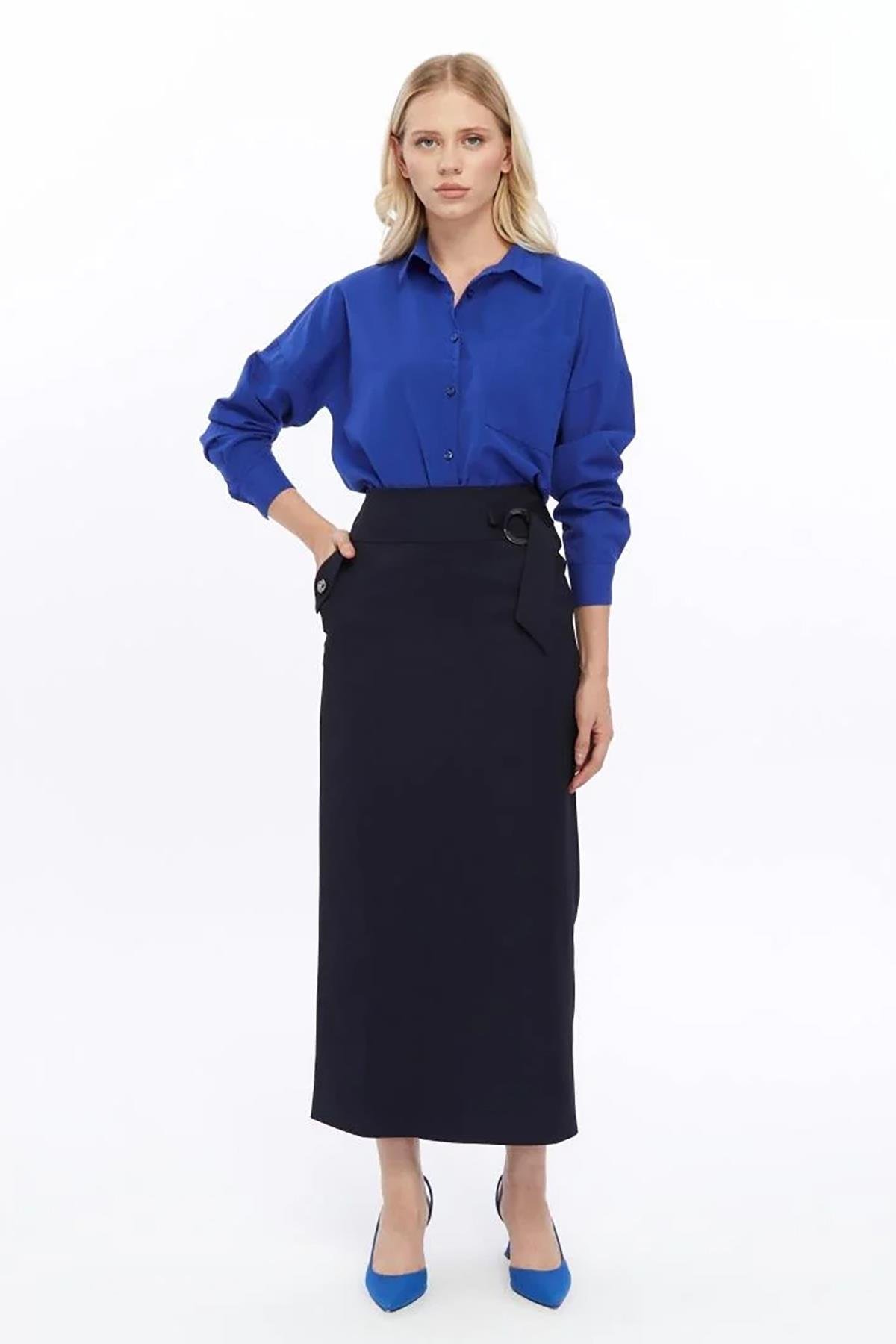 Stil Önerileri: Bu şık kalem etek, ofis şıklığınızı tamamlamak için harika bir seçenek. Üst olarak ince dokulu bir bluz ya da şık bir gömlekle kombinleyebilirsiniz. Hem rahat hem de profesyonel bir görünüm için topuklu ayakkabılar tercih edilebilir.