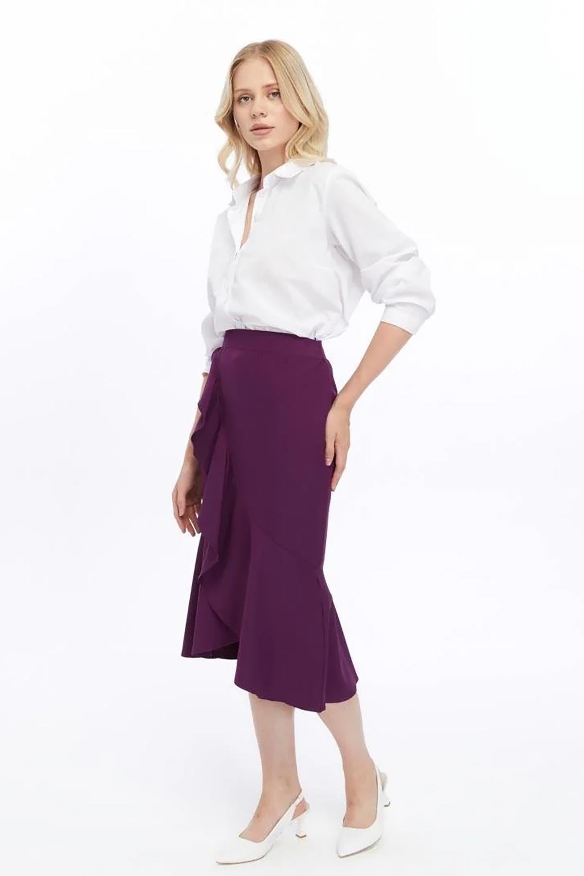 Renk: Mor Kumaş Türü: Scuba Krep Detaylar: Volan Detaylı, Fermuar Kapama Turu